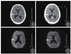 入院体检:体温36.2 ℃,心率68次/min,呼吸22次/min,血压129/65 mmHg(1 mmHg=0.133 kPa)。神志清楚,言语流利;双侧瞳孔等大等圆,对光反射灵敏;双肺呼吸音清,未闻及干湿性啰音;心律齐;腹平软,无压痛、反跳痛及肌紧张;四肢肌力、肌张力正常;双侧指鼻试验及跟膝胫试验稳准,双侧巴氏征阴性,闭目难立征阴性。实验室检查:血、尿、便常规,凝血功能,肝、肾功能,心肌酶,甲状腺功能等均未见异常,同型半胱氨酸21.8 μmol/L(参考值:4.0~15.4 μmol/L)。头部CT示右侧大脑皮层未见明显异常(图1A)。入院诊断:右侧颈总动脉与颈内动脉起始处重度狭窄。入院当日予阿司匹林肠溶片100 mg口服、1次/d,硫酸氯吡格雷75 mg口服、1次/d,阿托伐他汀钙20 mg口服、1次/d,吡拉西坦氯化钠注射液250 ml静脉滴注、2次/d。入院第3天(6月14日)13:00,患者在局麻下接受主动脉弓造影+全脑动脉造影+右侧颈内动脉支架置入术,对比剂为碘克沙醇;13:30,采用高压泵经右股动脉分10次注入未加温的碘克沙醇注射液共150 ml,15:30手术结束。患者术后意识清楚,神经系统查体无阳性体征。术毕查头部CT:右侧大脑皮层密度增高、脑沟内见高密度影(图1B),考虑对比剂滞留。术后10 h(6月15日1:45),患者出现发热,体温38.4 ℃,给予注射用萘普生钠275 mg静脉滴注退热治疗,体温未见明显下降,此后患者出现嗜睡,同时出现意识障碍、失语、饮水呛咳。急查体:不完全运动性失语,双侧咽反射迟钝,伸舌明显左偏,左侧肢体上下肢肌力Ⅱ级,肌张力减低,左侧巴氏征阳性,右侧肢体活动自如,右侧巴氏征阴性。美国国立卫生研究院卒中量表评分为13分(意识水平:1分,意识水平提问:2分,面瘫:2分,上肢运动:3分,下肢运动:3分,言语障碍:2分)。查头部磁共振成像(magnetic resonance imaging,MRI)示右侧大脑皮层信号增高,脑沟变浅(图1C)。考虑为对比剂脑病(contrast-induced encephalopathy,CIE)。立即给予充分水化,注射用甲泼尼龙琥珀酸钠80 mg静脉滴注、1次/d,甘露醇注射液125 ml静脉滴注、2次/d,左乙拉西坦0.25 mg口服、2次/d治疗。术后第2天(6月16日),患者体温恢复正常,言语不利情况好转,可简单表达,左侧肢体无力症状减轻;当日17:34,患者出现癫痫发作性抽搐1次,发作时双眼向左侧凝视,牙关紧闭,双上肢抖动,双下肢紧绷,持续约3 min后自行缓解;立即予丙戊酸钠0.2 g口服、2次/d对症治疗;术后第3天(6月17日),患者意识清楚,言语流利,左侧肢体无力较前好转,可自行活动,无饮水呛咳,无发热及抽搐;术后第5天(6月19日),患者症状完全缓解。复查头部MRI示右侧大脑皮层高信号降低,脑沟恢复正常(图1D)。患者住院治疗10 d后上述症状完全缓解,病情好转出院。出院后1、3、6个月回访,患者无不适主诉。
