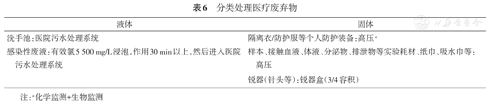 分类处理医疗废弃物见表6。注意:高压灭菌器需要年检,大容积的非快开门式高压灭菌器需要"特种设备作业人员证"。医疗垃圾袋双层包装,贴有标识,不可装载过满。高压后医疗废弃物需要专门的医疗垃圾转运箱及转运车运送,每日对医疗垃圾桶、转运箱及转运车进行消毒。高压洗消间,设立窗户,安装紫外灯及灭蚊灯,一层及地下室必要时安装防鼠板。