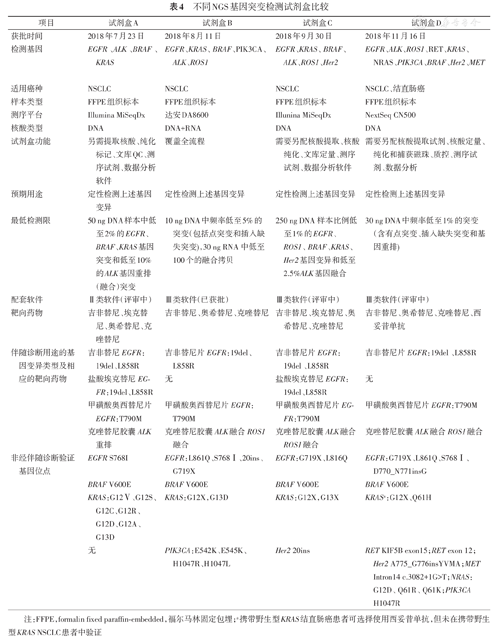 随着NGS技术的进步,在临床诊疗过程中基因检测在NSCLC患者治疗中日益广泛,从最初的单基因检测发展到多基因检测,使得NSCLC更加趋向细化诊断、精准治疗,也为NSCLC的诊疗提供了更多的可能性。目前NMPA批准了四种测序试剂盒可用于NSCLC的伴随诊断,现将四种试剂盒的检测基因、标本类型、测序平台、检测限、靶向药物等归纳分析见表4。