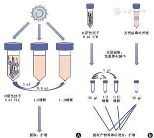 注:A为模拟混采样本制备,B为提取后混合模板制备;VTM为病毒保存液