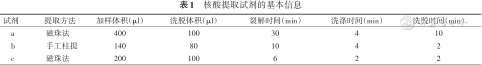 | 试剂 | 提取方法 | 加样体积(μl) | 洗脱体积(μl) | 裂解时间(min) | 洗涤时间(min) | 洗脱时间(min) |