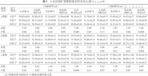 1.不同提取试剂的提取效率比较:使用a、b、c提取5 000和1 000拷贝数/ml的模拟混采样本,并用试剂A和试剂B扩增提取产物。试剂A、B的N和ORF1ab基因检测循环阈值(Ct)均为a提取组<b提取组<c提取组,a提取的模板较b、c提取的模板检测Ct值分别提前2.10±0.47和3.46±0.62。这一结果表明a试剂的提取效率高于b和c试剂。