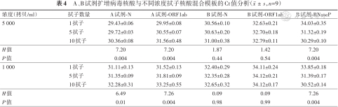 A、B试剂扩增模拟混采样本的Ct值(,n=9)