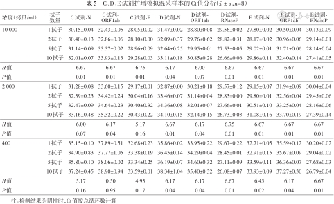 C、D、E试剂扩增模拟混采样本的Ct值分析(,n=8)
