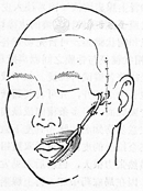 以筋膜抽取器于大腿外侧取20 × 2.5cm阔筋膜一条、等宽劈为3份。然后于上下唇中央稍偏健侧各作长0.5~0.7cm小横切口。再于患侧口角旁或沿鼻唇沟作切口,长约1.2~1.5cm。另一切口在鼻翼旁。于同侧颞部发际内1cm行由内上方向外下方的斜切口,长5cm。