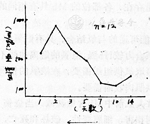 本组选取存活二周以上12例特重型烧伤病人,定期测定血清Mb,其平均峰值。最早在伤后2小时发现血清Mb升高,以最初三天最高,达500µg/L以上,在48小时出现最高峰Mb达916.6µg/L,以后逐渐下降(见图1)。