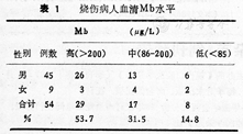 54例烧伤病人血清Mb测定,85.2%(46/54)呈高、中度升高。29例(53.7%)出现高Mb血症,17例(31.5%) Mb血症,8例无Mb血症。见表1。