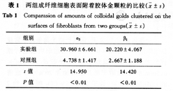 Comparasion of amounts of colloidal golds clustered on the surfaces of fibroblasts from two groups (