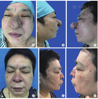 患者女,62岁,酒渣鼻出现鼻背部肿物30余年,因近5年肿物增大并影响呼吸睡眠就诊。既往有高血压病史2年。专科检查:鼻背和鼻尖部可见一圆锥形赘生肿物,基底覆盖鼻背中部、双鼻翼大部、鼻尖和鼻小柱,大小约5.5 cm × 4.0 cm × 3.5 cm,色暗红,表面凹凸不平,浅表毛细血管扩张,无明显溃烂渗出,无波动感、压痛和毛发生长,坐位时,肿物末端达上唇唇红线、覆盖右鼻孔大部和左鼻孔,并致左鼻孔变小畸形(图1A,图1B,图1C,)。辅助检查:血、尿常规,心肺、肝、肾功能及凝血功能未见明显异常,鼻部CT报告:考虑鼻前部皮肤良性软组织肿物,未侵犯鼻软骨。初步诊断:巨大鼻赘。