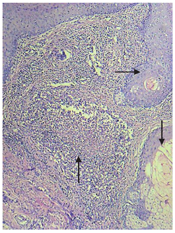 行鼻赘切除加中厚植皮术,从鼻背鼻赘根部设计一弧形切口完全切除鼻赘,术中见少许非脓性皮脂流出,肿物与周围组织分界清,未侵犯脂肪组织及软骨,基底多为瘢痕组织并与鼻软骨粘连,保留薄层瘢痕组织,以免鼻软骨外露,影响移植皮片成活。以左上臂为取皮区,参考鼻部创面大小取4 cm×4 cm全厚皮片,将皮片修薄为中厚皮片,植于鼻部创面,皮缘间断缝合。左上臂供区创面予丝线间断缝合。术中行肿物冰冻切片病理检查,结果显示:真皮胶原纤维组织增生,期间淋巴细胞浸润,并可见具有多核巨细胞的肉芽肿结节;术后肿物HE染色病理报告:间质慢性炎性细胞浸润,小脓肿形成,黏膜鳞状上皮增生,皮脂腺增生(图2)。术后2周,皮片存活良好,呈黄白色,质硬,鼻翼、鼻尖和鼻孔等外形得到修复(图1D,图1E,图1F),鼻腔通气功能明显改善。随访半年,皮片色泽与周围皮肤渐相近,质地变软,局部未见复发等异常。左上臂供皮区瘢痕增生不明显,患者满意。