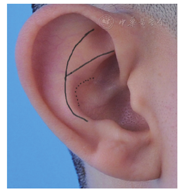 近年随着技术的发展,不少学者对经典术式进行改进、整合、创新,大量文献报道联合多种术式矫正招风耳取得良好效果[1,14,15,]。Mottaleb和Ashour[14]报道通过解剖分离耳后皮肤、直视下行耳后耳软骨及软骨膜划痕联合Mustarde缝合技术矫正30例59只招风耳,术后随访发现相比于其他术式,该方法手术时间及住院时间缩短,血肿、瘢痕等术后并发症减少,恢复快,术后疼痛轻,并且指出该简单方法适用于大部分招风耳患者。Kemalogˇlu等[1]报道联合多种术式矫正18例招风耳,其中伴有耳甲肥大的患者采用耳甲腔软骨-乳突骨膜缝合、Mustarde褥式缝合和耳甲腔软骨切除三联术式,不伴耳甲腔肥大的患者则采用耳甲腔软骨-乳突骨膜缝合(Furnas缝合)和Mustarde褥式缝合二联术式,平均随访10个月,患者满意度高,无复发,可见针对不同患者选择个性化的联合术式进行矫正,可获得良好效果,同时减少并发症的发生。Fioramonti等[15]应用小切口半穿刺、划痕、折叠、耳后褥式缝合固定4种方法联合矫正41例71只招风耳,结果显示矫正成功率高、并发症发生率低,安全有效,具有可重复性,外观自然,与未手术耳的触觉和顺应性相似,并且指出除了常见招风耳,复杂招风耳畸形亦可考虑选用此联合术式。除了以上联合术式矫正招风耳,Uysal等[16]提出为防止招风耳术后"电话耳畸形",可在招风耳矫正术的基础上加用非对称的Z字整形技术,矫正耳垂前凸畸形,对19例患者术后随访1年发现,该方法可长期有效维持耳垂的位置。但目前关于招风耳整形是否去除部分皮肤尚未达共识,Kemalogˇlu等[1]将18例患者的耳后皮肤全部复位缝合,随访发现不去除皮肤,依然可以达到满意效果。