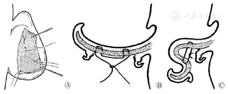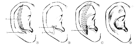 招风耳最开始主要由外科手术进行矫正。为了找到有效的治疗方法,学者们不断探索、实践,常常多种技术联合应用。1845年,Dieffenbach报道了第1例通过去除耳后多余皮肤联合耳软骨-乳突区固定术矫正招风耳(外伤后)的手术[10]。Ely于1881年报道通过去除耳后多余皮肤、耳甲-乳突区固定、耳甲软骨切除,联合矫正招风耳;Marestin则于1903年提出"应力记忆"的概念,并指出术后若要获得持久、肯定的效果,术中应该破坏软骨之间的应力记忆[1]。此后,关于通过破坏软骨应力记忆矫正招风耳的文献大量发表[1]。1963年,Mustardé [2]首先提出利用永久性褥式缝合埋线法塑造对耳轮矫正招风耳(图1,图2),但目前很少单独应用,通常与其他术式联合使用。Gibson和Davis [13]认为在软骨表面进行破坏性操作,如切开、擦刮或刻痕等,可使打破其表面的交互应力平衡,软骨将自动地向软骨表面被破坏的一侧弯曲,从而使软骨凸向破坏侧,即软骨应力释放原理。Stenstrom[3]最早将这一原理应用于招风耳整形术(图3),取得了满意的效果。Converse等[4]则在保留软骨前软骨膜的情况下于舟状窝位置,平行于对耳轮的方向切开耳软骨,然后利用水平褥式缝合法将软骨折叠成管状,以形成对耳轮的形状,从而达到矫正畸形的目的,但透过薄薄的耳前皮肤可以看到锋利的软骨嵴,对耳轮缺乏圆滑自然的线条美,因此目前该方法已很少单独使用。