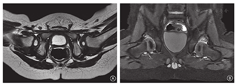 牵引石膏组入院后先行10~14 d双下肢垂直(屈髋90°)悬吊牵引,根据牵引后肌肉放松情况逐渐增加外展、屈髋角度(增加至110°)(图1)。牵引外展达60°以上时于手术室在吸入麻醉下行闭合复位及人类位石膏裤固定(图2)。术中评估外展< 60°不能维持复位或安全区(髋关节最大外展角度和股骨头复位后逐渐内收再次脱出时的外展角度之差)<20°时,放弃石膏裤固定。石膏裤固定术后行MR检查评估复位是否成功(图3)。石膏裤固定位置满足屈髋约110°、外展<60°,固定时间为患儿月龄(如患儿3月龄则石膏固定3个月),6周~2个月后根据石膏裤松紧更换二期石膏裤。牵引石膏治疗复位失败的患儿行切开复位手术治疗。