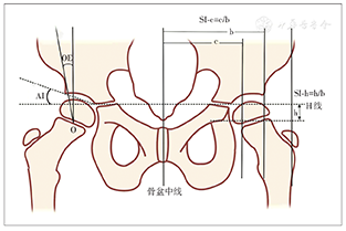 双侧"Y"型软骨连线与髋臼骨顶连线的夹角(图4)。反映髋臼骨顶形态,髋臼骨顶越倾斜AI值越大,提示髋臼骨顶发育越差。