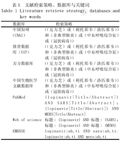 计算机检索中国期刊全文数据库(CNKI)、维普中文科技期刊全文数据库(VIP)、万方数据库(Wangfang Data)、中国生物医学文献数据库(CBM)、PubMed、Web of Science、EMBASE等数据库,此外,检索了中文医药类报刊、WHO以及美国和中国CDC网站、发表文献的参考文献。然后再用文献追溯和人工查阅文献等方法作为辅助。检索关键词包括非典型肺炎、非典、严重急性呼吸综合征、SARS、MERS、冠状病毒、洛匹那韦/利托那韦、Lopinavir/ritonavir、LPV/r等,检索年限为2003年1月至2020年1月。各数据库的检索策略见表1。