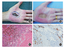 患者,男,40岁。因出生时左手掌皮肤有胎记,颜色黑、无毛发、平于皮肤、无结节状增生、无破溃出血、未治疗,随生长发育色素痣等比例增大。1年前自觉胎记变大,遂至外院皮肤科门诊行激光治疗,具体激光型号不详。激光治疗后胎记未消除且明显增大增厚,伴结节状增生,偶有破溃出血,无卫星灶。整形外科检查:左手掌近腕部见一3.5 cm×2.0 cm肿物,色黑,稍突起于皮肤,表面见结节状突起,最大直径0.3 cm,无破溃。双侧腋下及颈部未触及肿块或肿块淋巴结。肺部及腹部CT检查未见异常。完善术前检查后,在局部麻醉下行左手掌皮肤肿瘤切除植皮术。术中根据国际皮肤黑素瘤诊疗原则于左手掌皮肤肿瘤缘外侧距离>1 cm全层切除皮肤肿物,皮下深达腱膜上层,送术中冰冻。术中冰冻报告:各切缘及基底未见肿瘤累及,考虑黑素瘤可能性大。术后病理:大体检查见带线椭圆形皮肤组织4.5 cm×3.0 cm×0.8 cm,表面见3.5 cm×2.0 cm灰黑区。镜下病理提示左手掌皮肤黑素瘤,肿瘤最厚处2 mm,各切缘未见肿瘤累及。免疫组织化学结果:S-100(+)、HMB-45(+)、Mela-A(+)、CK(-)、SOX10(-)、KI67(+/-)、Syn(-)、Vim(+)。术后植皮成活良好。而后患者转诊至肿瘤医院行干扰素a2b+重组人白细胞介素-2治疗。术后6个月随访,一般情况好,植皮区无坏死,未见局部复发灶,无淋巴结转移,无远处转移灶。见图1。