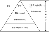 在"患者就医冰山理论模型"中,就医行为属于"显性因素",往往可以通过问诊、体格检查、辅助检查等方式进行评估;而患者的想法(ideas)、担忧(concerns)、期待(expectations)往往是隐藏在背后的,很难被规范和评估,所以我们称之为"隐性因素"。依据"冰山理论","显性因素"属于露在外面的"冰山一角",而"隐性因素"才是真正的主体,是患者就诊的真实原因及目的,所以"显性因素"必然由"隐性因素"来决定。运用患者就医冰山理论模型,在医患沟通过程中发掘患者就诊的内在驱动因素,满足患者的隐性需求,能够促进医疗服务水平提升,更好地实现生物-心理-社会三维医学模式的无缝对接。