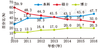 在专业分布方面,内科专业招录的住院医师人数最多,占总人数的14.0%(2 269名);其次,外科占13.5%(2 196名),全科医学占10.4%(1 697名),中医科(含中医全科)占10.6%(1 718名)。近7年来全科医学、儿科、麻醉科等紧缺专业,招生名额有较大的增加,与2010年相比,2016年各科人数分别增加113.3%(143名)、98.6%(69名)和157.4%(96名)。
