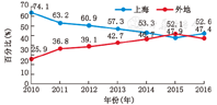 2010—2016年,共招录了规培医师16 241名。招生人数呈逐年上升趋势。招录所有医师中,男性所占的比例显著小于女性(36.9%,5 994人),每年情况基本一致(图1);本科学历的占比逐年递减,研究生占比呈增长趋势(图2);外地生源占总人数的42.5%(6 905名),而且呈明显增长趋势(图3)。各系统中,上海交通大学系统招录的人数最多,占总人数的37.4%(6 074名);其次为复旦大学系统(23.6%,3 831名);同济大学、第二军医大学和上海中医药大学系统的招录情况基本相当。