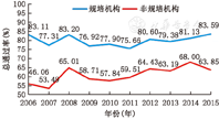 对比近10年的上海市规培机构执业医师考试通过率发现,在2010年上海市住院医师规范化培训制度出台之前,总体考试通过率呈下降趋势,尤其是在技能考试方面;但2011年以后,尤其是2013年之后,执业医师考试总体通过率出现平稳上升趋势,2015年的规培机构考试通过率达到83.59%,比2011年的75.66%高出了10%左右。同时,规培机构的执业医师考试通过率比非规培机构稳定高出20%左右(图4)。