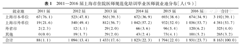 2011-2016届上海市住院医师规范化培训毕业医师就业地分布[人(%)]
