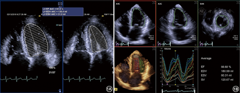 应由二维(双平面Sipmson法)(图1A)或三维超声方法测定左心室舒张末期(EDV)和收缩末期(ESV)容积[当左心室形态正常且无节段性室壁运动异常时,也可由M型超声Teichholz法获得,但最新美国超声心动图学会(ASE)/欧洲心血管影像学会(EACVI)指南中已不再推荐使用[1]]。射血分数(EF)=(EDV-ESV)/EDV×100%。LVEF不仅广泛应用于临床决策,同时是大多数心脏疾病临床预后的预测因子。另外,LVEF与年龄、性别和体表面积无明显相关性。成人LVEF正常参考值范围:53%~73%。