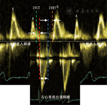 是1995年由日本学者Tei等[2]提出的一个评价心脏收缩与舒张整体功能的参数。可由脉冲多普勒或者组织多普勒测量获取等容收缩期(IVCT,二尖瓣A峰结束至左心室流出道频谱起始时间)、等容舒张期(IVRT,左心室流出道频谱结束至E峰起始时间)和射血时间(ET,左心室流出道频谱持续时间)。MPI(Tei指数)= (IVCT + IVRT)/ET,当左心室收缩功能减退时,IVCT和IVRT延长以及ET缩短,因此MPI测量值增大。因其可以准确估测心脏整体功能,具有简便、敏感性高、重复性好的优点。MPI>0.47提示左心室收缩功能减低。见图3。