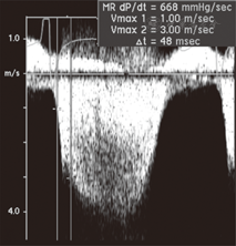 左心室dp/dt代表等容收缩期左心室压力上升的速率,在一定程度上反映的是左心室收缩功能,采用连续多普勒频谱测定获得,需要有二尖瓣反流(MR)的存在,A4C获得MR连续多普勒频谱,测定左心室压力上升速率。一般计算MR在1~3 m/s之间的时间差[3](dt),dp=4v12-4v32=36-4=32 mmHg(1 mmHg=0.133 kPa),因此,dp/dt=32/dt。dp/dt正常参考值>1 200 mmHg/s,dp/dt<1 000 mmHg/s为异常。见图4。