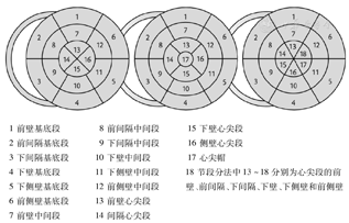 根据室壁运动幅度及收缩期增厚率,对节段室壁运动进行评分,1分:运动正常或增强,心内膜运动幅度≥ 5 mm;2分:运动减弱(hypokinesis),心内膜运动幅度2~4 mm;3分:无运动(akinesis),心内膜运动幅度<2 mm,如瘢痕心肌;4分:矛盾运动(dyskinesis),室壁收缩期变薄,多见于室壁瘤。各室壁节段评分的总和除以参与评分的节段数,比值即为WMSI。WMSI为1,说明参与评分的室壁节段运动正常,WMSI越大,室壁运动异常程度越重。