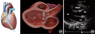 注:LA左心房;LV左心室;RV右心室;AV主动脉瓣;RVOT右心室流出道;Ao主动脉;RC主动脉右冠瓣;NC主动脉无冠瓣;CS冠状静脉窦;DA降主动脉