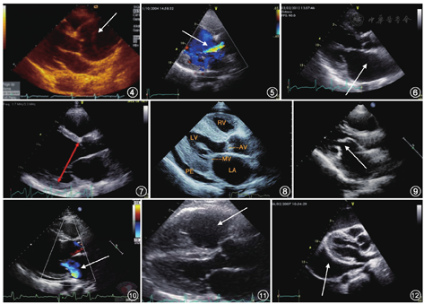 | 心包 | 心包积液(图12) | 炎症、甲状腺疾病、肾功能不全、肿瘤等 | 微量生理性心包积液多位于左心室后壁房室沟处,且在舒张期消失 | ||