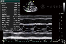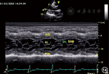 | 左心室 | 常用于测量左心室内径和射血分数,正常值和常见异常同二维超声(图13) | 左心室流出道梗阻时SAM征(图14) | 舒张末期测量内膜至内膜的垂直距离,取样线置于二尖瓣瓣尖水平并垂直于室壁,当心尖上翘取样线不能垂直于室壁时,不能采用此方法 | ||