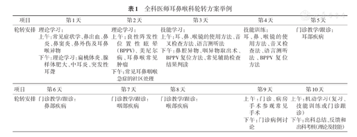 创建双向反馈和评估机制主要从入科前、转科期间、出科前三个环节入手:①入科前应由全科教研室联系轮转科室、发出轮转介绍信,沟通全科医师的轮转时间、人数和轮转目标(包括理论和技能要求),协助相关科室制定全科医师具体的教学安排或轮转手册。以为期2周(10个工作日)的耳鼻喉科轮转为例,建议入科前反馈的安排详如表1所示,具体的学习内容可机动调整,其他学科可根据本科室的教学能力、轮转时间、轮转要求和社区所需工作内容斟酌调整。入科前科室的反馈还包括与全科医师沟通各项规章制度和轮转的注意事项。②转科期间反馈主要由全科医师当面或借助微信等网络平台及时反馈轮转中遇到的问题及其解决方案建议,也可通过反思日志促进师生互动沟通。另一方面,带教老师或全科教研室通过加强教学巡查、教学查房、病例讨论、角色扮演、标准化病人、360°评估、临床演练评估(Mini-CEX)等方式来评价全科医师的岗位胜任力并给予有效反馈。③出科前反馈主要包括科室原有的出科考核,还可通过全科医师轮转的调查问卷、出科座谈会等途径了解轮转收获及对不足之处的改进措施,并创建全科医师与带教老师、轮转科室之间的双向评分机制(必要时采用匿名方式)。