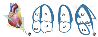 注:RV右心室;TV三尖瓣;RA右心房;LV左心室;MV二尖瓣;LA左心房;AV主动脉瓣;AO主动脉