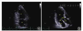 (3)观察分析室壁厚度及运动、有无局部运动异常(心肌缺血、梗死)或膨出(室壁瘤)。例2:冠心病心肌梗死后患者左心室心尖部室壁运动消失,心尖部室壁瘤并血栓形成(视频3);例3:左心室肥厚(视频4);例4:肥厚梗阻型心肌病患者,心腔中部梗阻,心尖部室壁瘤形成(视频5)。
