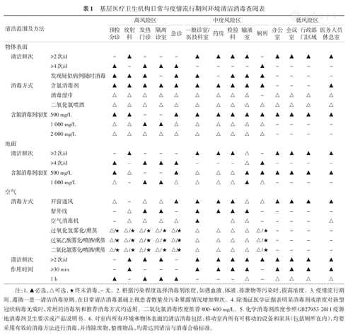 按照《医院空气净化管理规范》,加强诊疗环境通风管理,严格执行《医疗机构消毒技术规范》等文件要求,做好环境、器械、患者用物等的清洁消毒,有效降低医疗机构内的传播风险,保障医疗质量和医疗安全,基层医疗卫生机构日常与疫情流行期间环境清洁消毒见表1[3]。