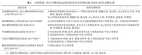 不同指南、共识中糖尿病远端对称性多发性神经病(DSPN)临床诊断标准
