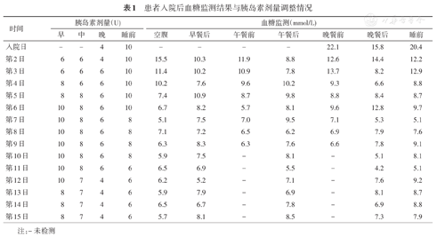 入院治疗后血糖监测与胰岛素剂量调整情况见表1。