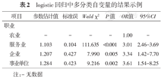 建议:多分类变量尽管习惯用1、2、3、……等数值表示,但除非确定它们存在明显的等级顺序,否则分析时需将其作为分类变量纳入模型。对于一个k类的自变量,如果将其作为分类变量纳入模型,会输出k-1个结果,分别反映了与参照类(由研究者根据专业情况指定)相比,其他类别发生结局的风险大小。表2显示了职业作为四分类时的结果,以农业作为参照类,服务业、企业、事业单位分别与农业相比的OR值等结果。