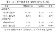 对于第2个问题,作者对MNA的分析中以例数最少的"明确营养不良"作为参照类,这种分析方式很容易导致本来有意义的变量变得无统计学意义。以本例数据为例,表3比较了以"营养状况良好"作为参照和以"明确营养不良"作为参照的结果。可以看出,"明确营养不良"为参照,由于例数太少(3例),导致其余两类与其相比均无统计学意义,从而得出该变量无统计意义的结论;而以"营养状况良好"为参照(60例),"营养不良风险"与其相比则有统计学意义。这种情况下,仍可认为该变量有统计学意义。