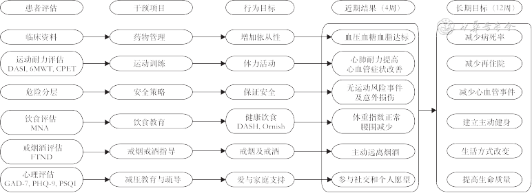 | 生活方式改变 | ①应用MNA评估饮食与营养状况 ②评估吸烟与饮酒,FTND评估 | 以控制体重为目标。多学科团队合作指导患者健康饮食、戒烟戒酒和参与社会活动。参考接近DASH饮食[11]和Ornish饮食[12],形成与心血管健康密切相关的健康生活方式 | 体重指数正常或接近正常,腰围正常或接近正常,戒烟戒酒 | 延缓动脉粥样硬化进展,预防MACE再发,改善预后 |