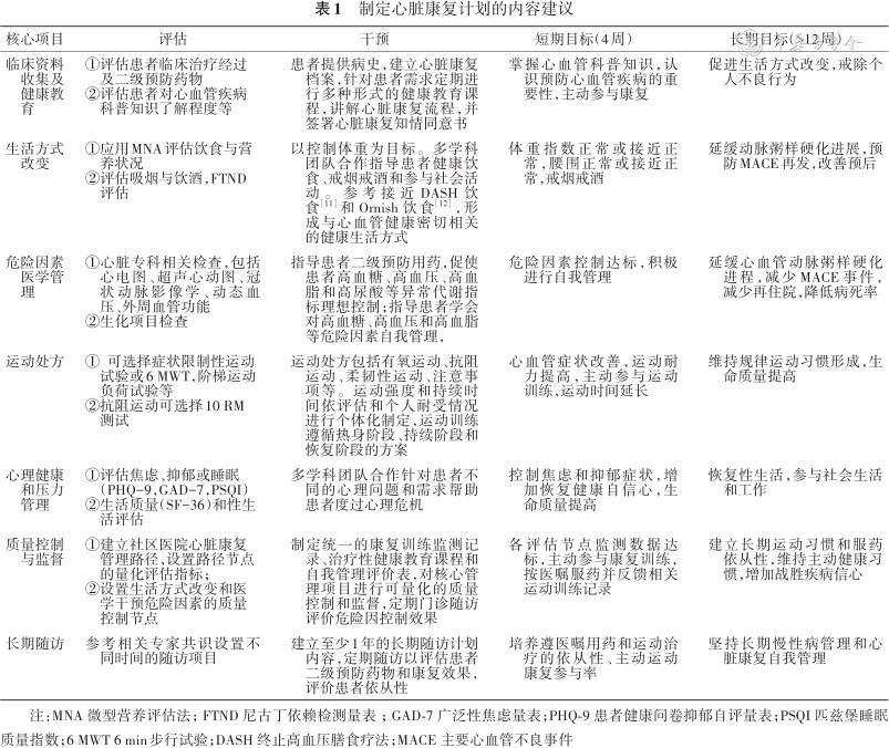 2. 心脏康复计划核心管理项目:心脏康复团队制定详细的个性化心脏康复计划对患者提高生活质量和预防心血管事件复发至关重要。心脏康复的5个核心管理项目包括患者评估、运动训练、饮食指导、危险因素管理(吸烟、血脂、血压、体重、糖尿病)和心理干预[10]。按照心脏康复核心管理项目和心脏康复计划框架,制定结构化心脏康复计划可规范社区医院心脏康复管理路径。制定统一的心脏康复监测记录、治疗性健康教育课程和自我管理评价表,以此监督全科医生实施心脏康复质量控制,增强患者生活方式改变和遵守二级预防药物,实现预防发生不良心血管事件的长期康复目标。核心管理项目相关内容见表1。