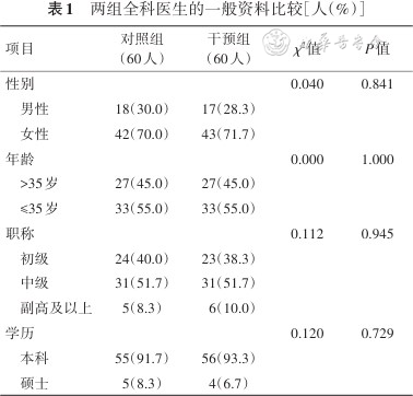 1. 学员一般资料:对照组男性18名(30.0%),女性42名(70.0%),年龄(36.12±5.74)岁。干预组男性17名(28.3%),女性43名(71.7%),年龄(36.43±5.93)岁。两组一般资料比较差异无统计学意义(均P>0.05),见表1。