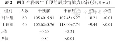 两组全科医生干预前后共情能力比较(分,)