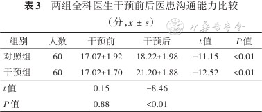 3. 两组全科医生干预前后医患沟通能力比较:干预前,两组全科医生医患沟通能力得分比较差异无统计学意义(P>0.05);干预后,对照组和干预组医患沟通能力得分均较干预前提高(均P<0.05),且干预组高于对照组(P<0.05)。见表3。
