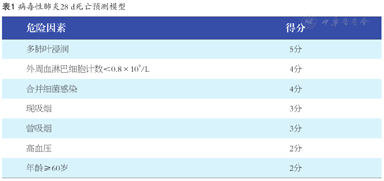 关于CAP病情严重评估的研究从未间断。Fahim等发现成纤维细胞因子21(FGF21)参与糖、胰岛素及线粒体能量代谢过程,而重症感染往往使这一过程失衡。利用FGF21预测患者30 d病死率,ROC曲线下面积明显优于CURB-65。AIM/CD5L是巨噬细胞凋亡抑制因子,我国学者曹具发现其对脓毒症28 d死亡的预测ROC曲线下面积为0.86(95% CI: 0.79~0.92)高于SOFA评分0.77(95% CI:0.67~0.89),该结果在成人验证队列中得到了证实。在病毒性肺炎方面,我国学者瞿介明、周敏、张欣教授团队提出了基于6个危险因素的病毒性肺炎28 d死亡预测模型(表1),以12分为界值的敏感性和特异性分别为77.6%和77.8%,优于目前常用评分。高水平肾上腺髓质素原、pro-BNP、IL-6即使在无心脏基础病患者中亦可有效预测短期及长期心脏不良事件的发生。