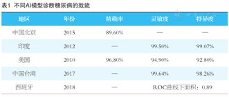 随着深度神经网络、超限学习机方法、支持向量机方法及自然语言处理等技术的发展,越来越多的AI模型如"瑞宁知糖"等正在丰富预测模型的构建(表1)。北京理工大学基于中国健康与营养调查数据库,采用支持向量机方法建立AI模型,其预测糖尿病的精确率为94.2%,可召回率为93.9%。台湾的Shu T等人建立的AI模型,通过识别糖尿病患者的脸部特征如色素沉着、皮纹等预测对象是否患病,灵敏度可达99.64%。还有基于基因组数据的模型,通过分析单核苷酸多态性预测患糖尿病的ROC曲线下面积可达0.89。这些模型创伤性小、可及性高,每个健康人在手机或其他便携设备上均可获得,有效提高一般人群的筛查意愿,同时也为高风险人群制定筛查计划。