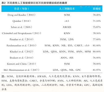 AI不仅能预测糖尿病患者的发病风险,还可以对糖尿病进行分型。线性判别分析、二次判别分析、朴素贝叶斯法及高斯过程分类等技术可协助分类4种类型糖尿病,指导后续糖尿病治疗方案的选择,对于一些无法进行胰岛功能试验或其他抗体检测的基层医疗机构多有帮助。表2展示了部分已发表AI模型的准确度,虽然AI已经能较为准确的分类不同类型糖尿病,但为了满足临床治疗需求,仍需进一步的算法升级。