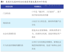 有学者基于对美国国际开发署资助20年的计划生育传播项目(Population Communication Services,PCS)(1982—2002年)和始于2008年的健康传播伙伴关系(Health Communication Partnership,HCP)项目的考察,总结出美国卫生援助的全球健康传播发展的四个阶段(表1),反映出从医疗和供给导向的模式演变为重点关注个人和社区作为健康生产者的一体化模式。