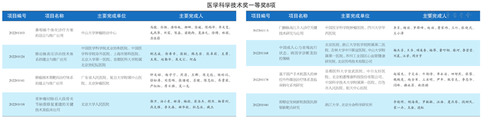 | 202201178 | 基于国产手术机器人的神经外科微创治疗体系及临床转化系列研究 | 首都医科大学宣武医院、中日友好医院、北京柏惠维康科技股份有限公司、中国科学技术大学附属第一医院、百色市人民医院、航天中心医院 | 赵国光、于炎冰、牛朝诗、单永治、田增民、张黎、魏鹏虎、赵全军、王亚明、尹丰、甄雪克、李忠华、闫峰、谢永召、赵德朋 |